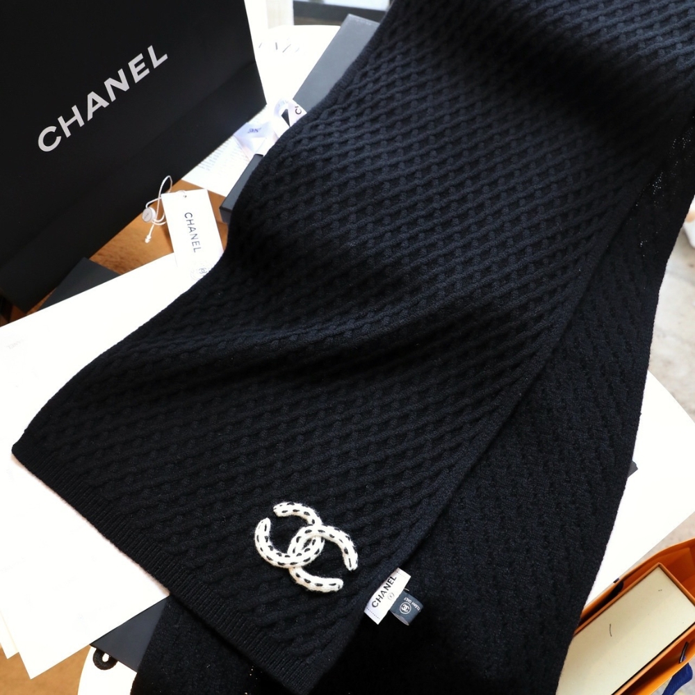 / Chanel Cc Logo Patch Cashmere Scarf Black