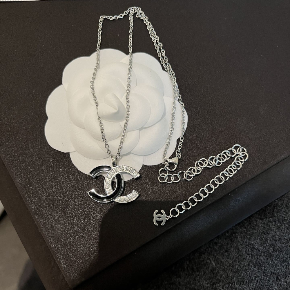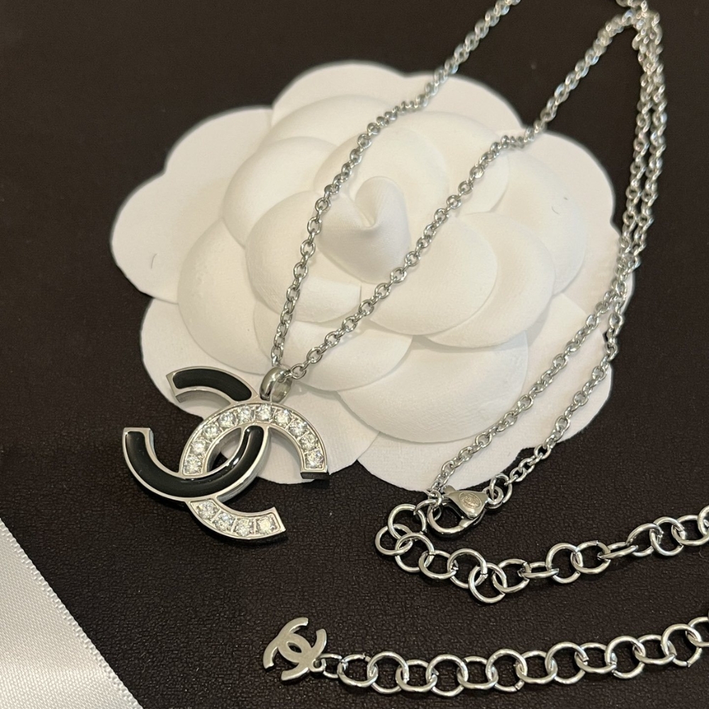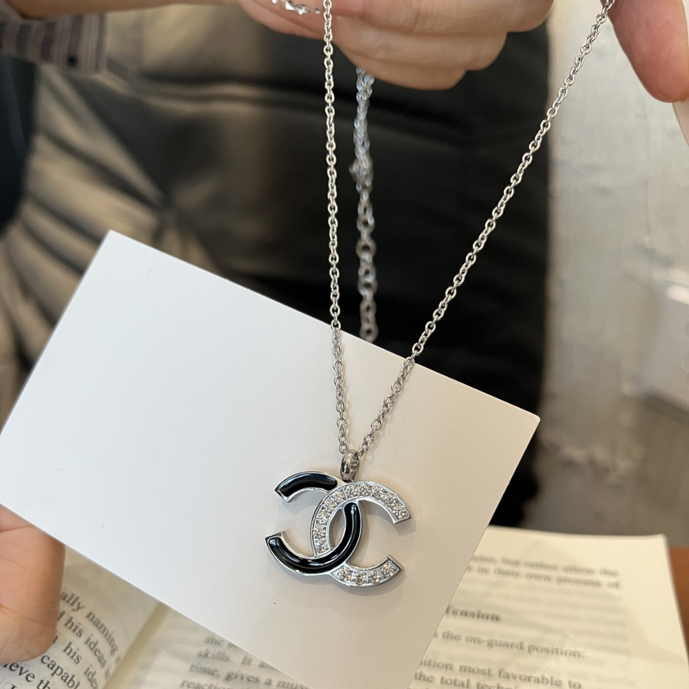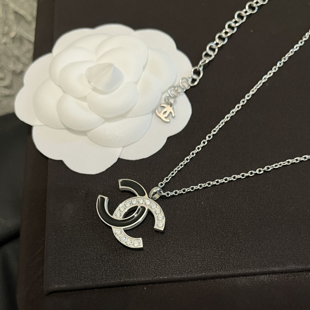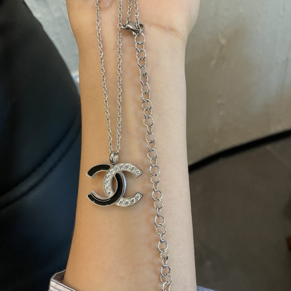 Chanel Cc Logo Pendant Necklace White Stones And Black Enamel Silver