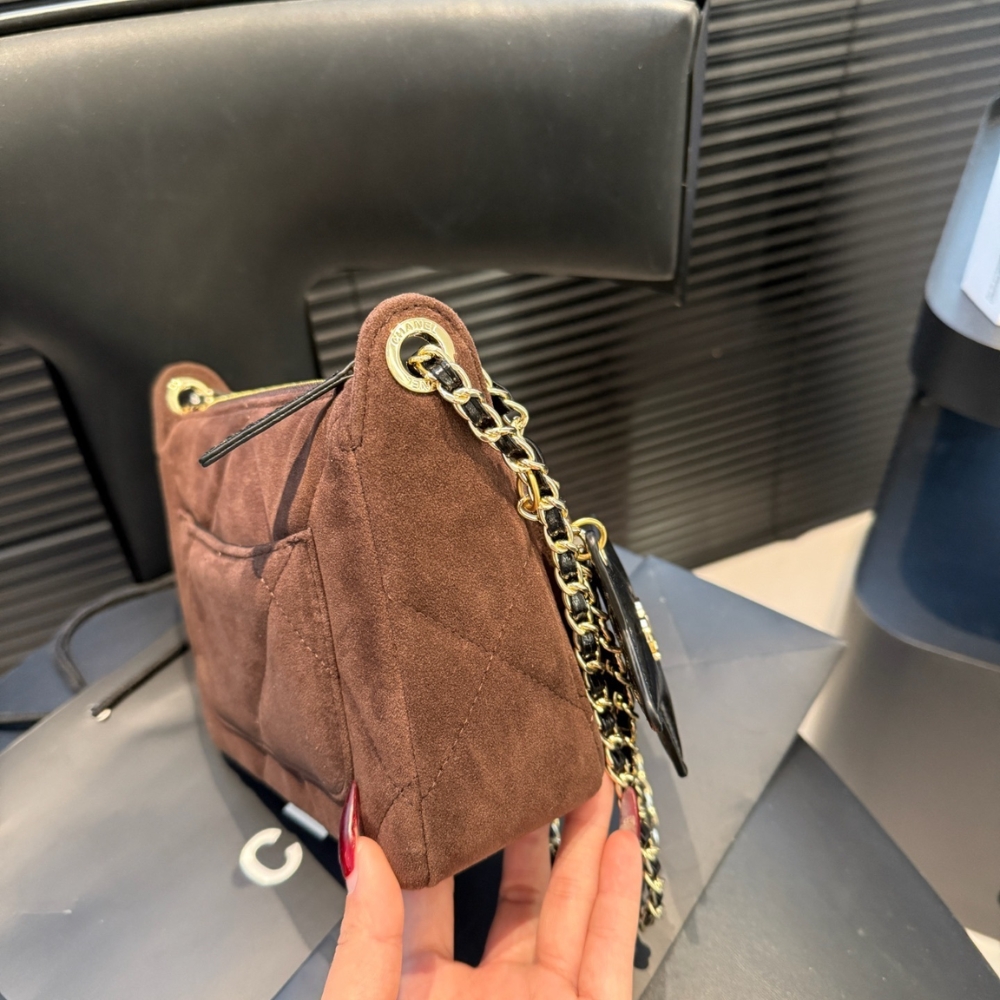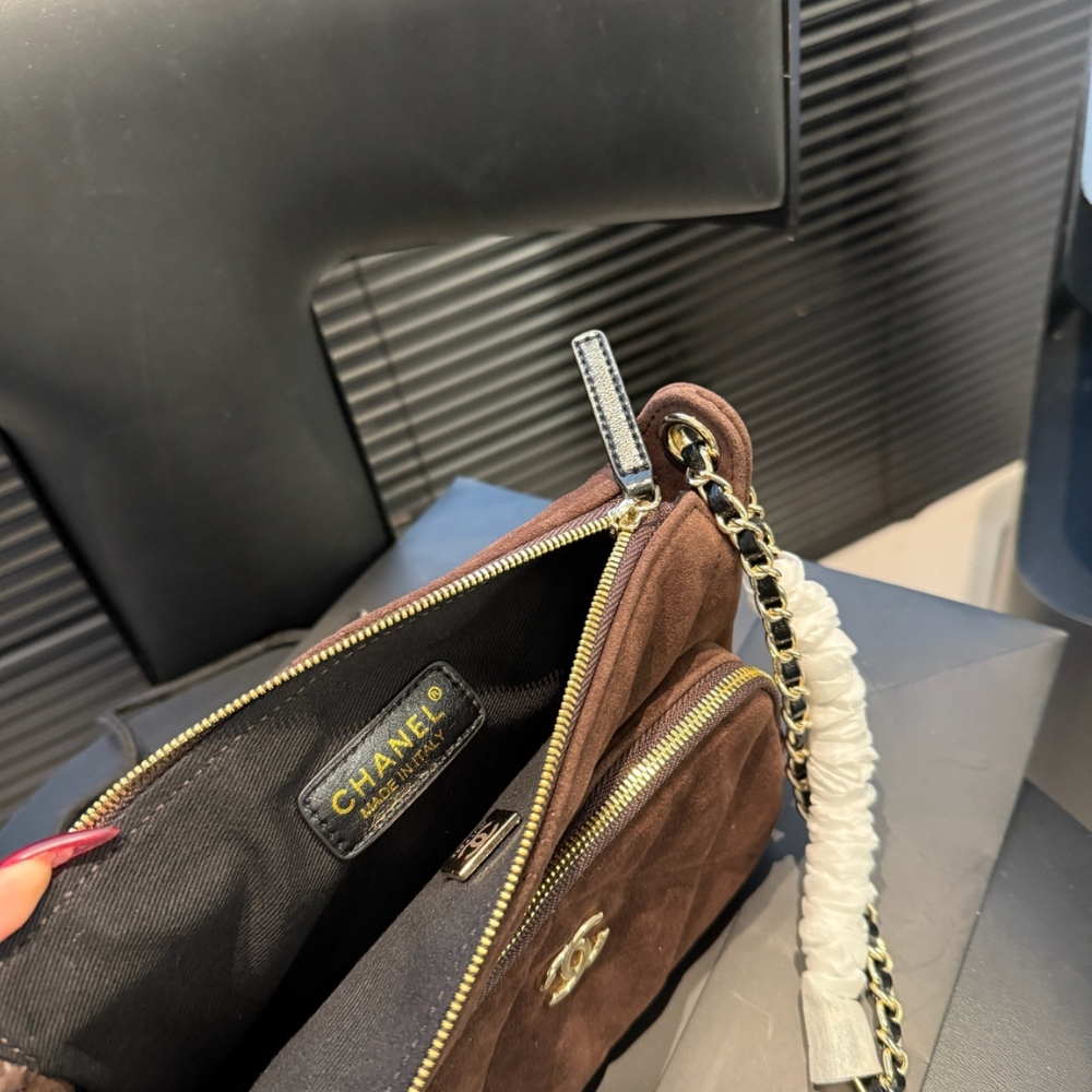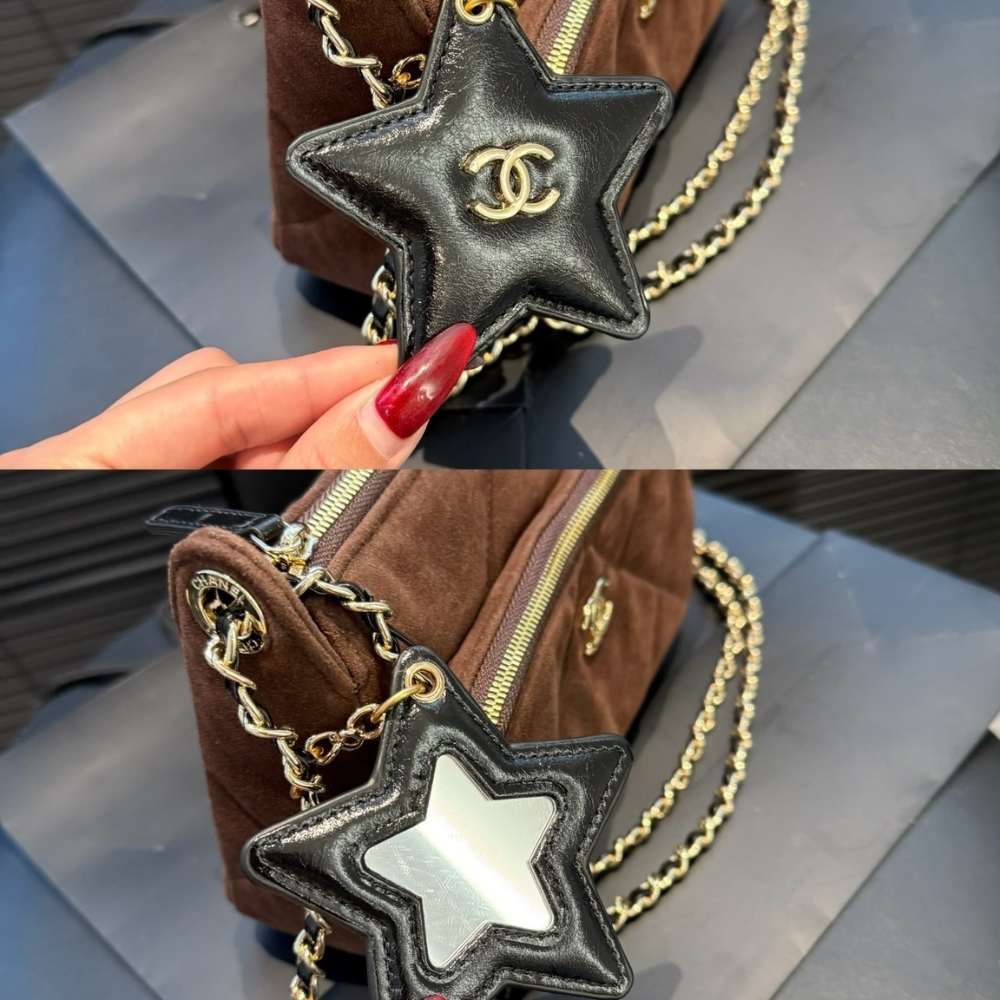 The Chanel Clutch With Strap is a luxurious fusion of sporty utility and high-fashion elegance, featuring a unique brown velvet-effect nylon finish with a modern glossy, wrinkled texture. The signature interlaced metal and leather chain strap allows for effortless transition between a chic shoulder bag and a contemporary crossbody. Complete with a whimsical star-shaped leather charm, this piece perfectly balances Chanel’s classic heritage with a playful, urban edge.