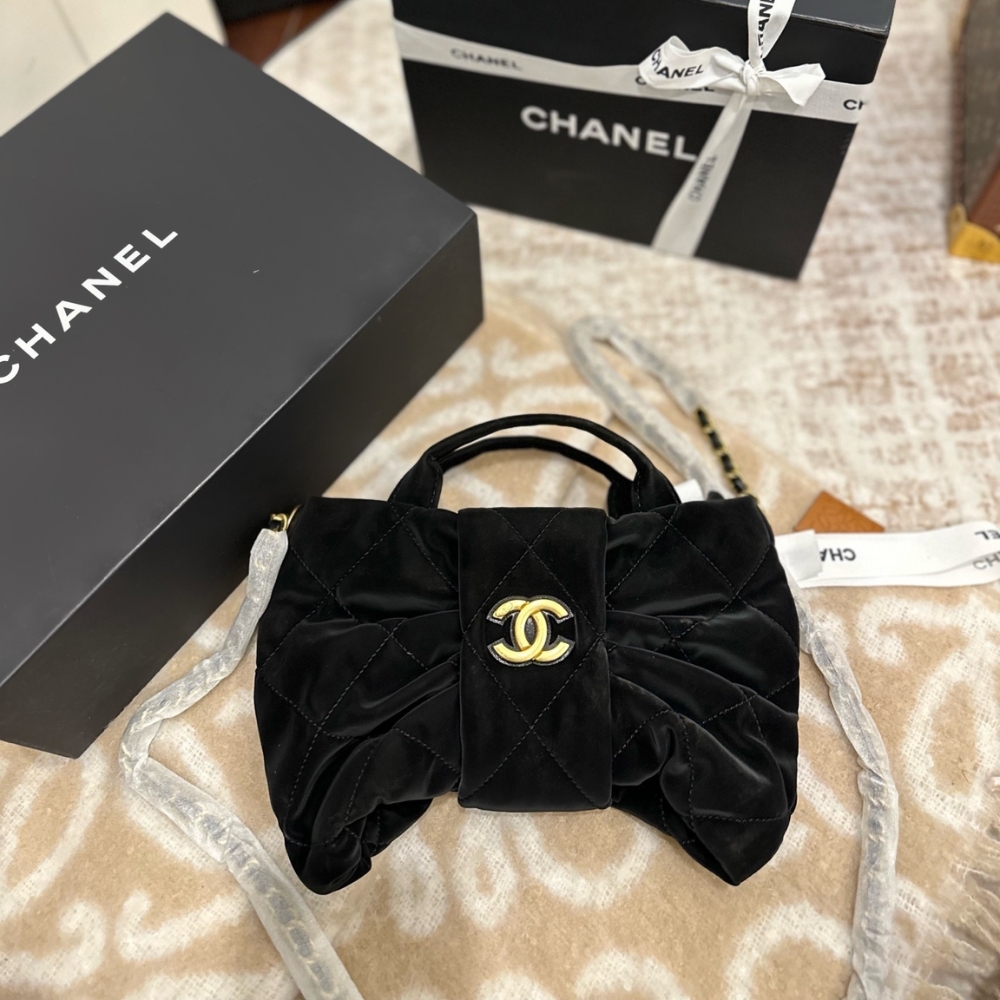 / CHANEL MINI BOW BAG VELVET EFFECT NYLON AND GOLD TONE METAL BLACK 21CM AS5851 B22154 94305
