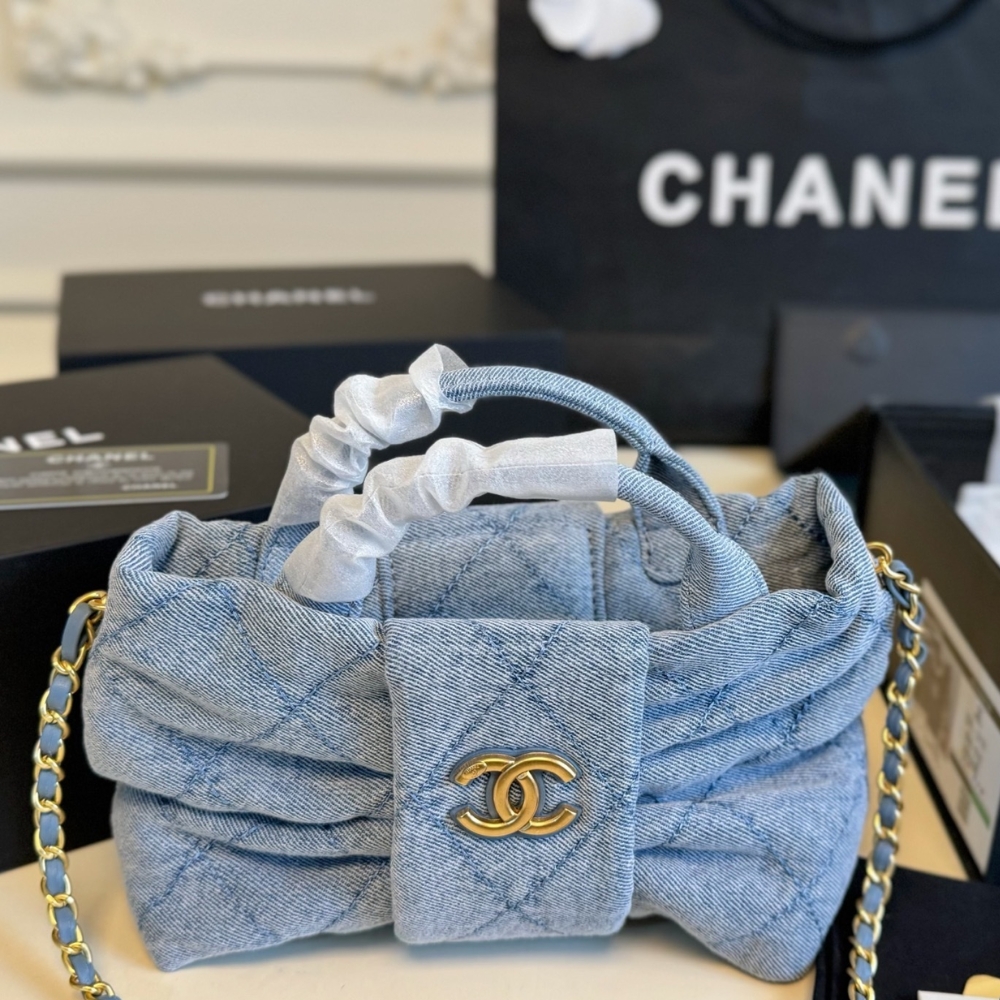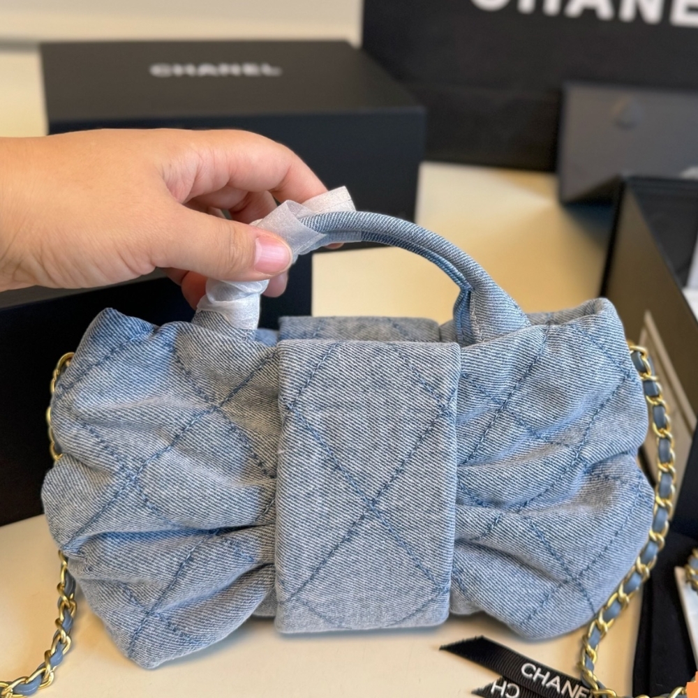 / CHANEL MINI BOW BAG WASHED DENIM AND GOLD TONE METAL BLUE 21CM