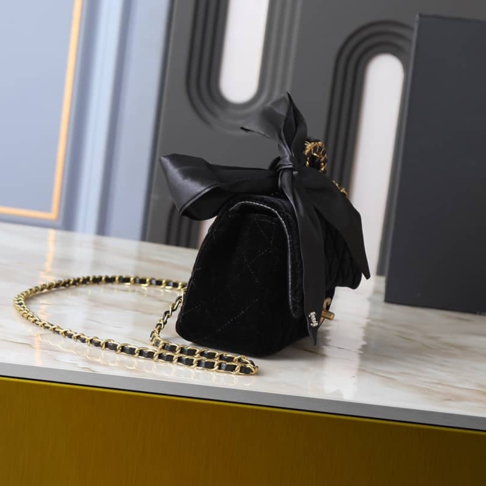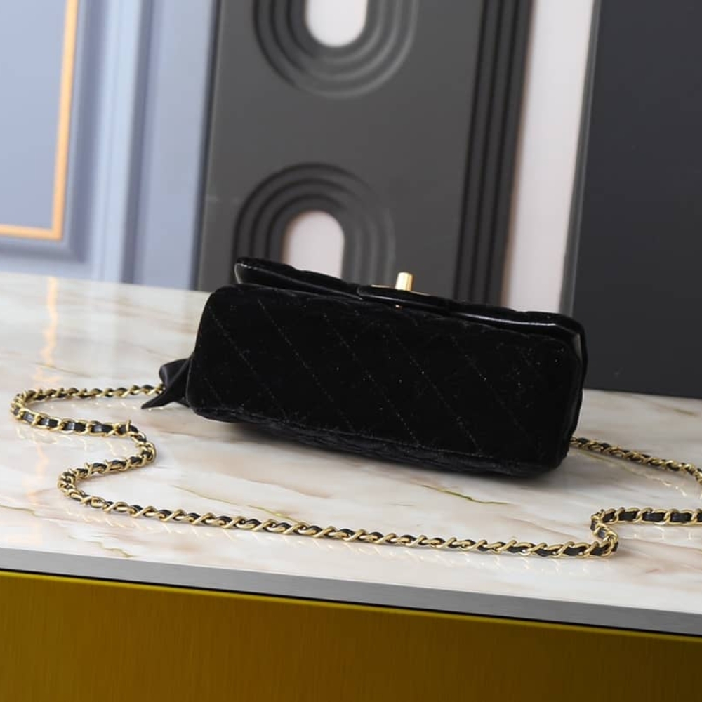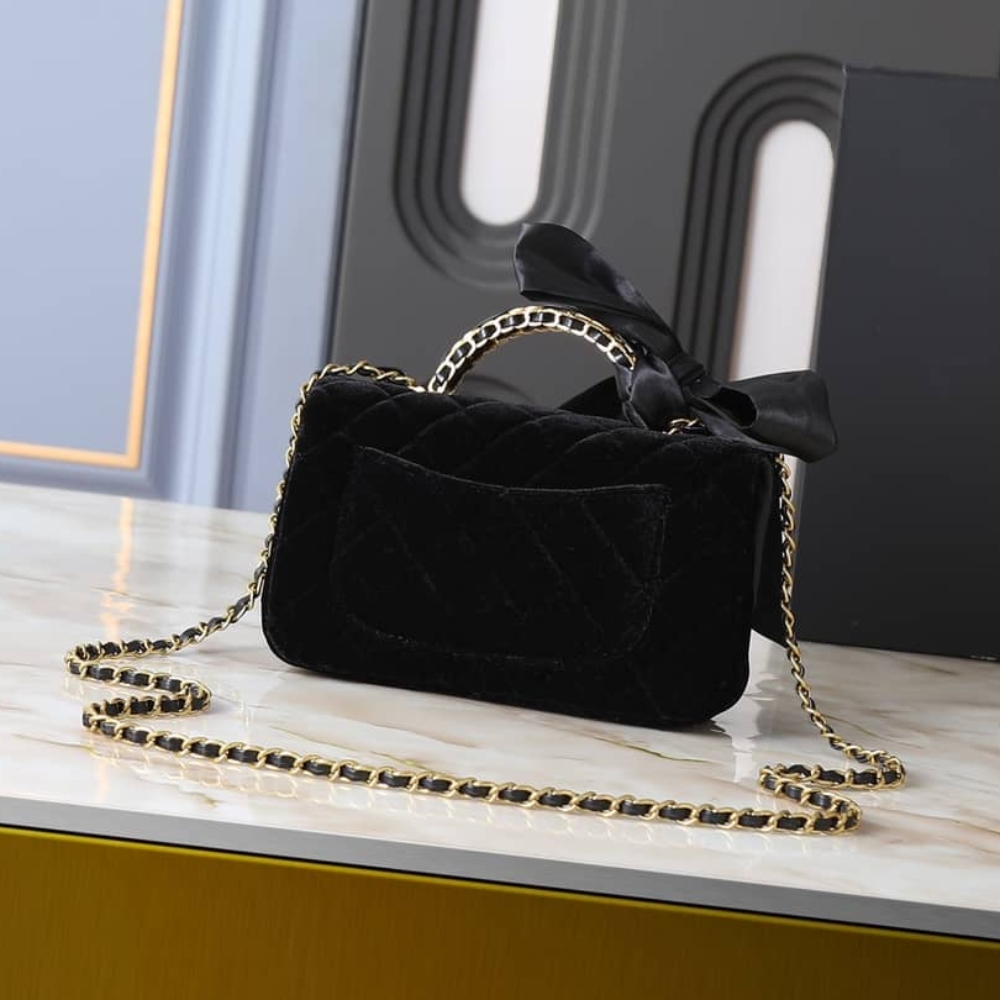 / Chanel Mini Flap Bag With Top Handle Velvet Silk And Gold Tone Metal Black 20Cm As5875 B22481 94305