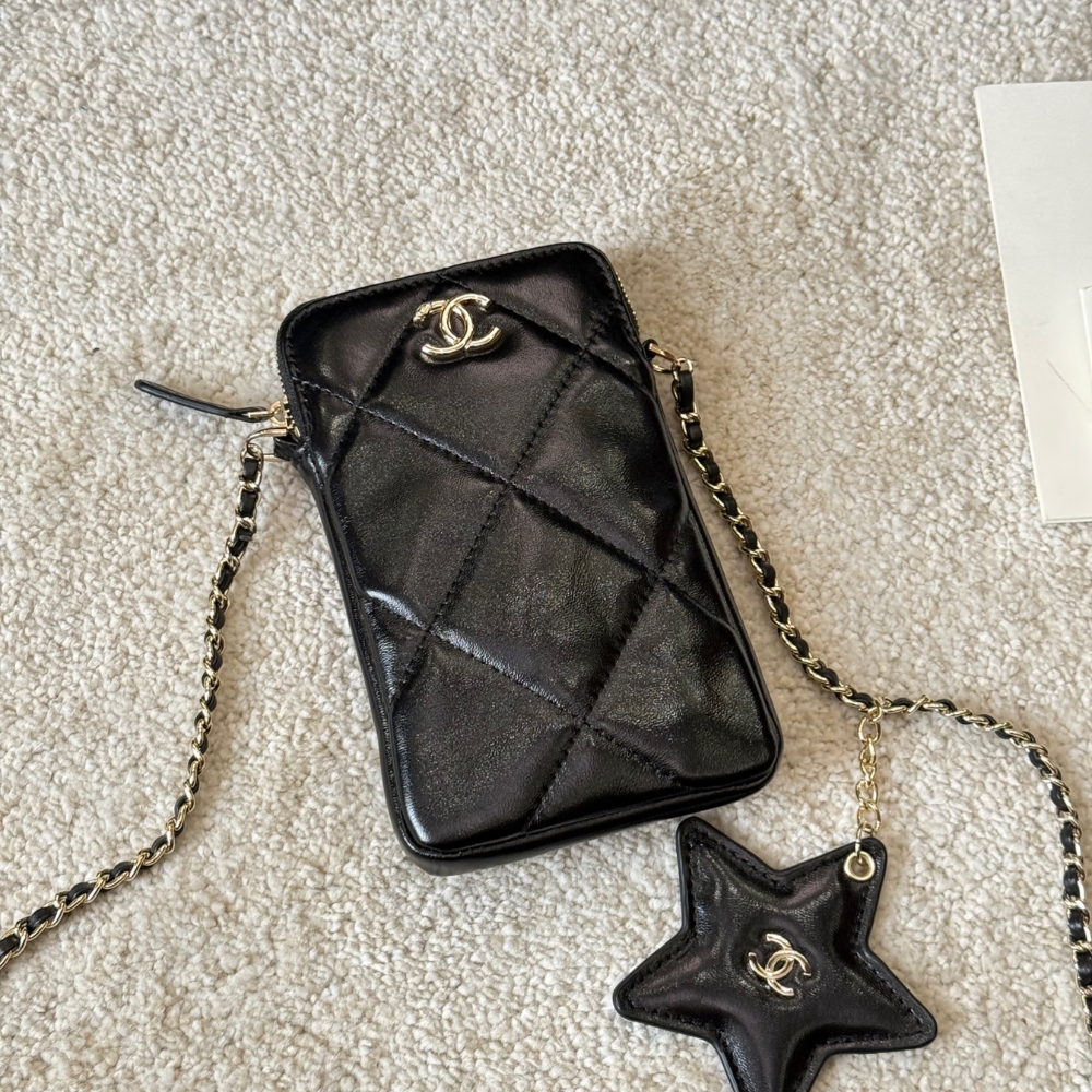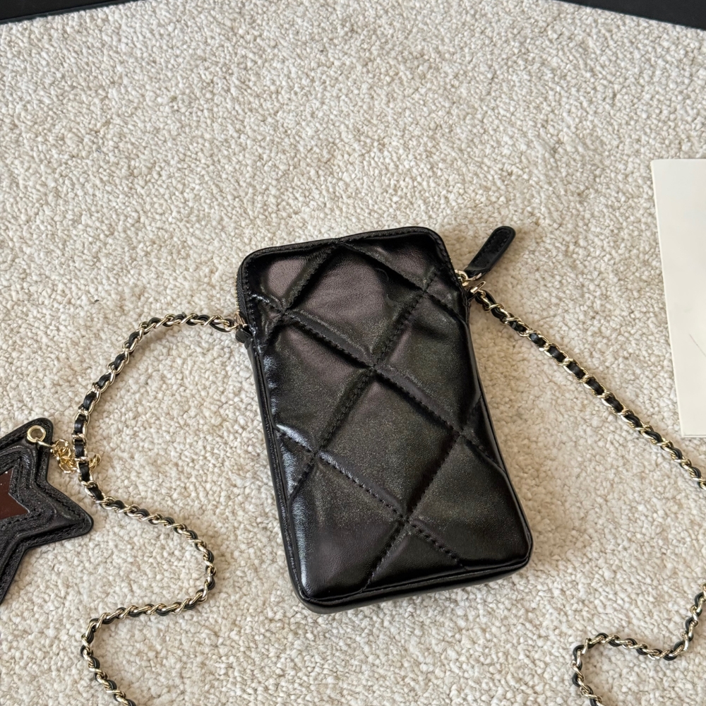 / CHANEL PHONE HOLDER WITH CHAIN SHINY CRUMPLED AND GOLD TONE METAL BLACK 18CM AP4777 B21296 94305