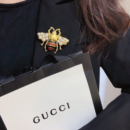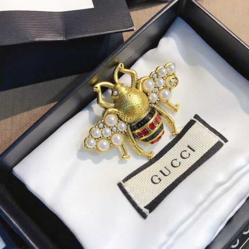 / GUCCI GG BLACK AND RED BEE BROOCH GOLD WITH PEARL