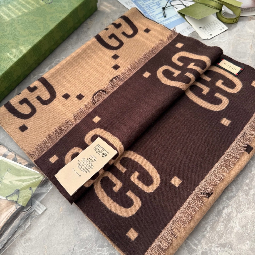 / GUCCI GG JACQUARD WOOL SILK SCARF BROWN AND BEIGE 180CM 495592 4G350 2179