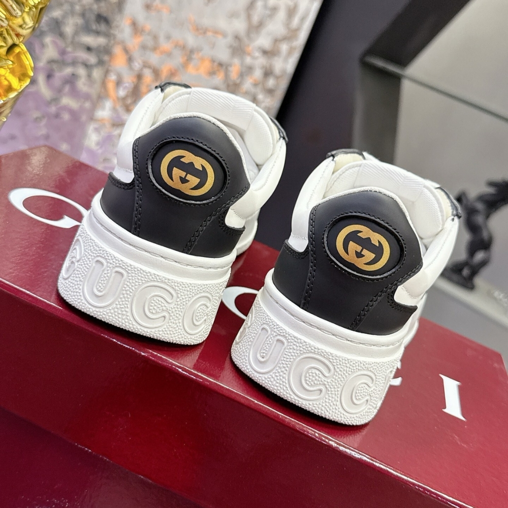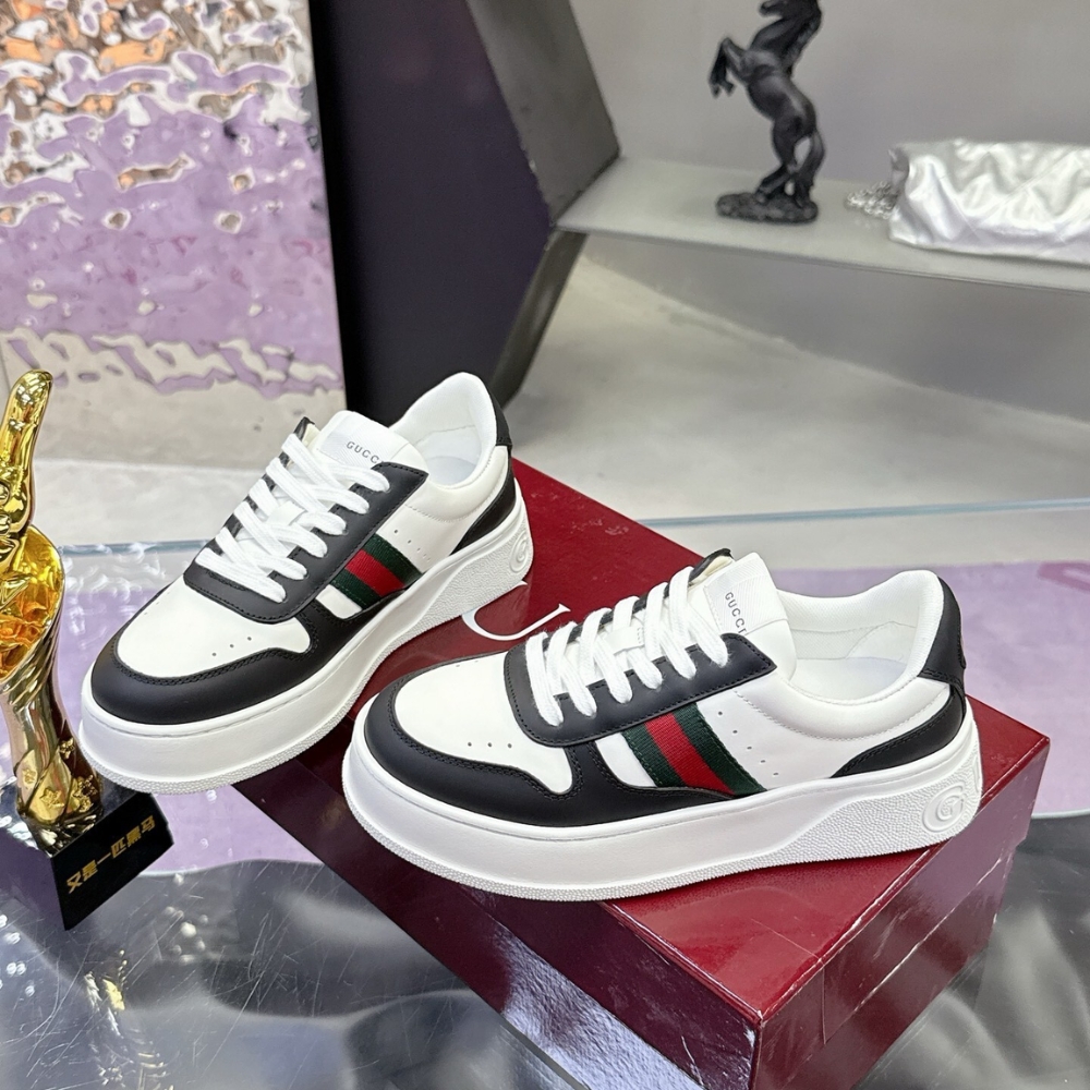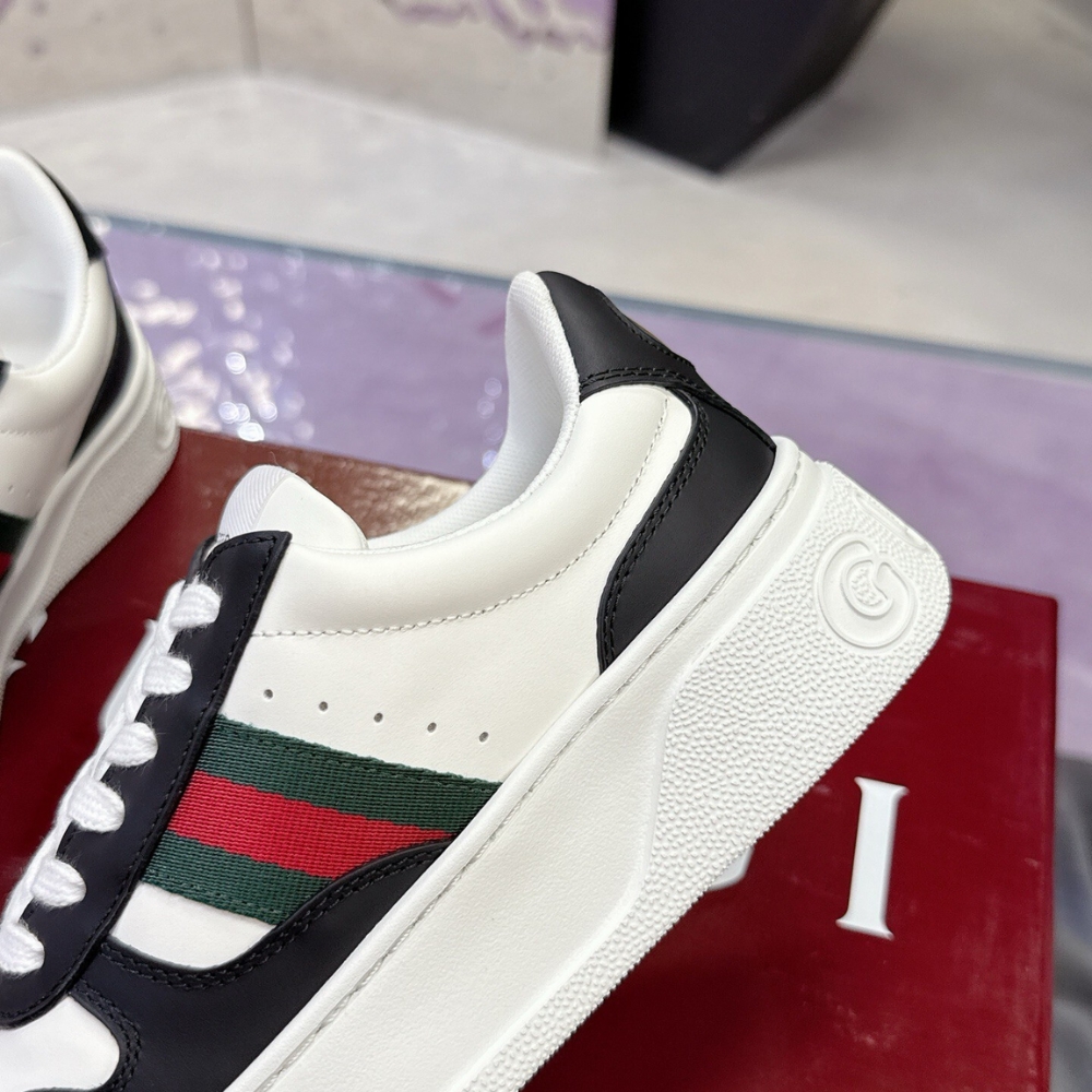 In the Fall Winter 2025 collection, with a chunky silhouette, this pair of trainers plays with shapes, colours and materials to create a retro feel. With a defined rubber sole, the shoe is crafted from leather, while the Web detail completes the style.