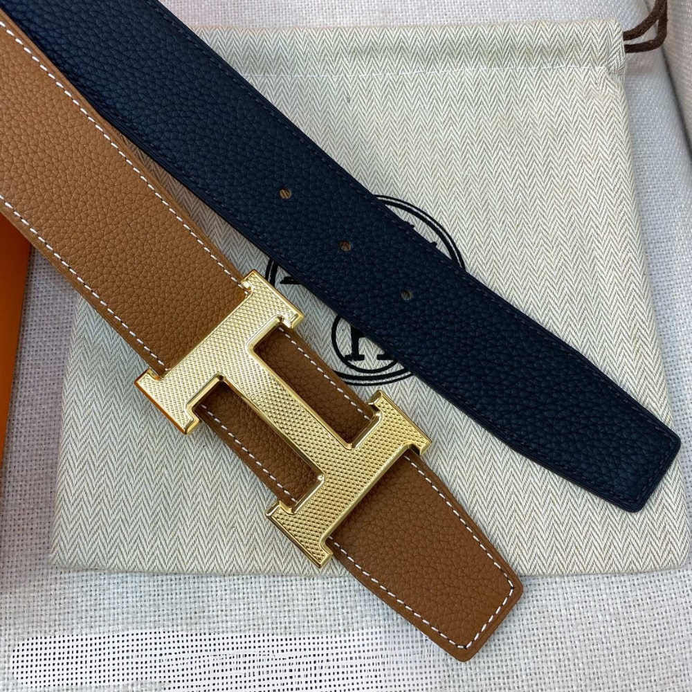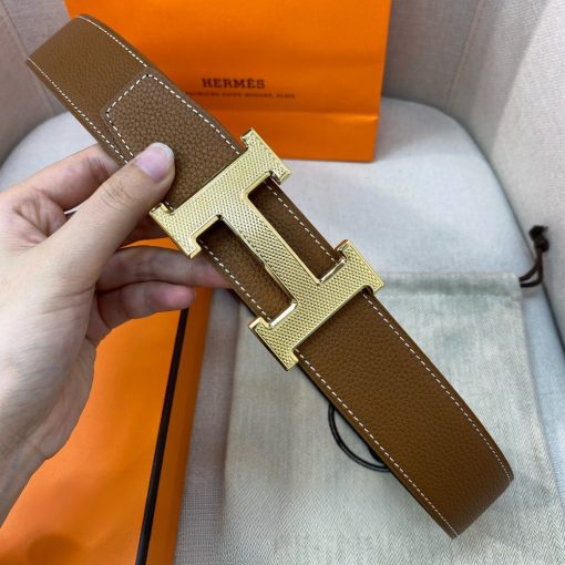 HERMES H GUILLOCHEE BELT BUCKLE AND REVERSIBLE LEATHER STRAP 32MM GOLD BROWN H064540CC06