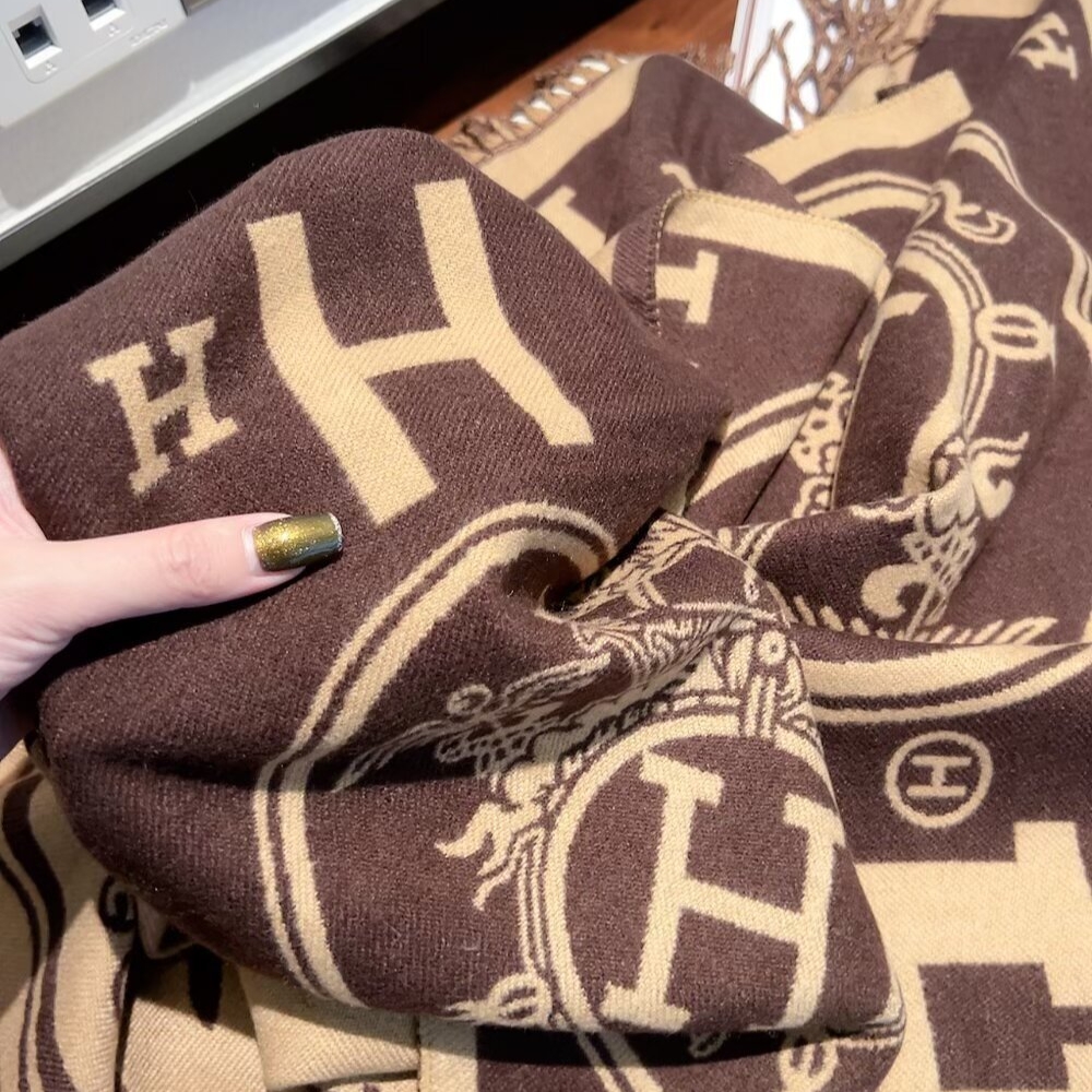 The Hermes Muffler H Logo Wool Shawl in brown is a sophisticated accessory crafted from a blend of wool and cashmere for exceptional warmth. It features a striking jacquard-woven design with large “H” logos and the iconic Caleche motif, finished with delicate fringed edges. This versatile 180cm piece can be styled as a classic scarf or a refined shawl, making it a timeless statement for any cold-weather wardrobe.