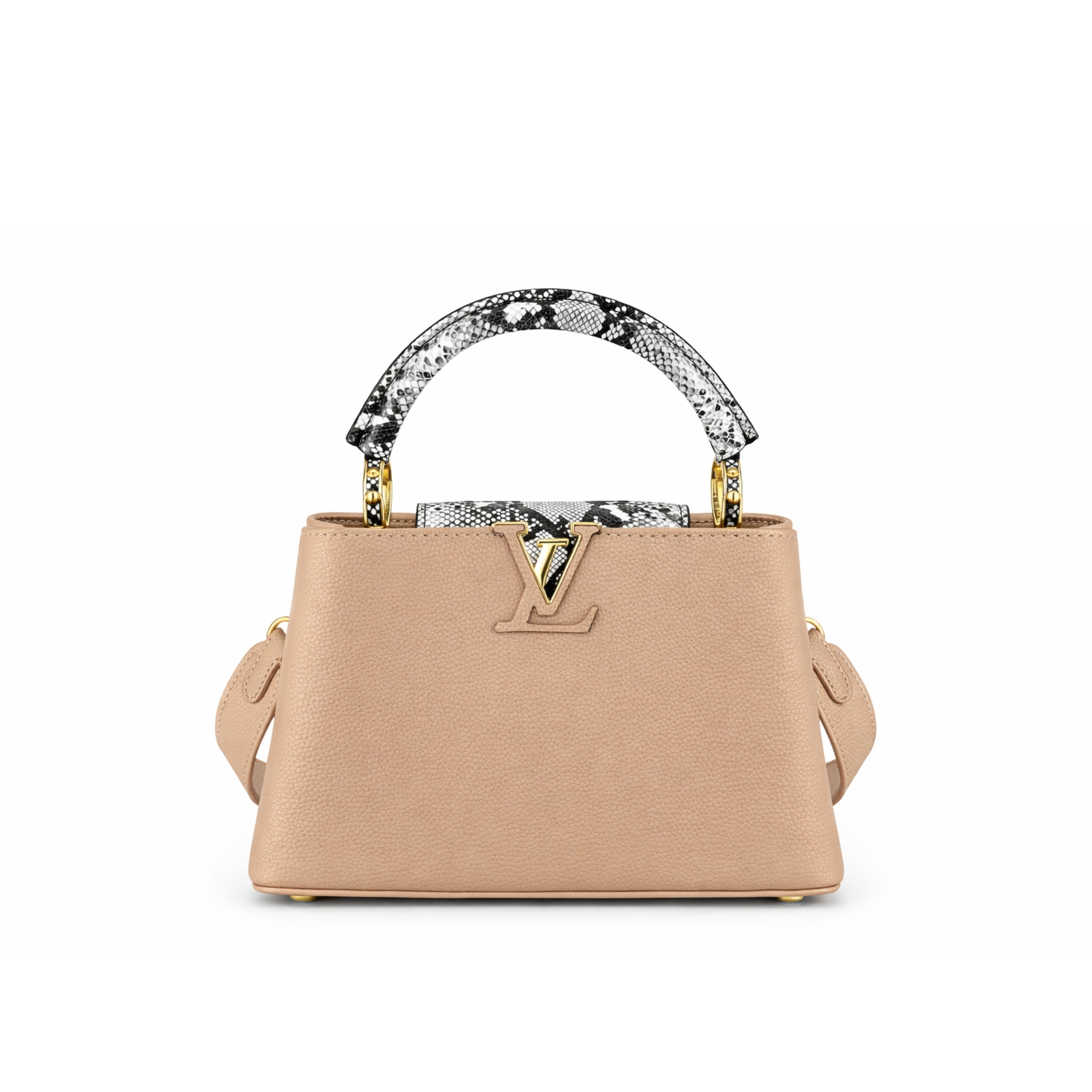 Fashioned from leather, the now classic Capucines BB handbag displays a host of House signatures: leather-wrapped LV Initials, jewel-like handle mounts inspired by historic trunks and a distinctive flap with a Monogram Flower motif.