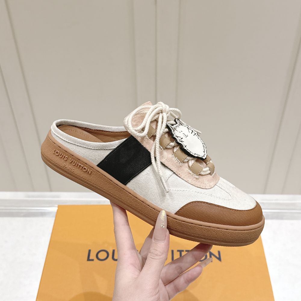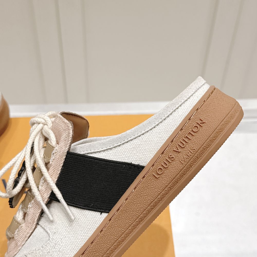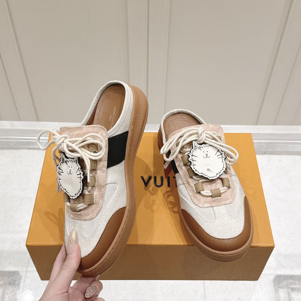 The Lous open-back sneaker is reworked this season in plain and Monogram-patterned canvas, while its double laces are embellished with a playful cat accessory. This versatile and stylish sneaker features discreet elastic inserts for easy fitting. It is finished with a supple rubber outsole bearing the Louis Vuitton signature.