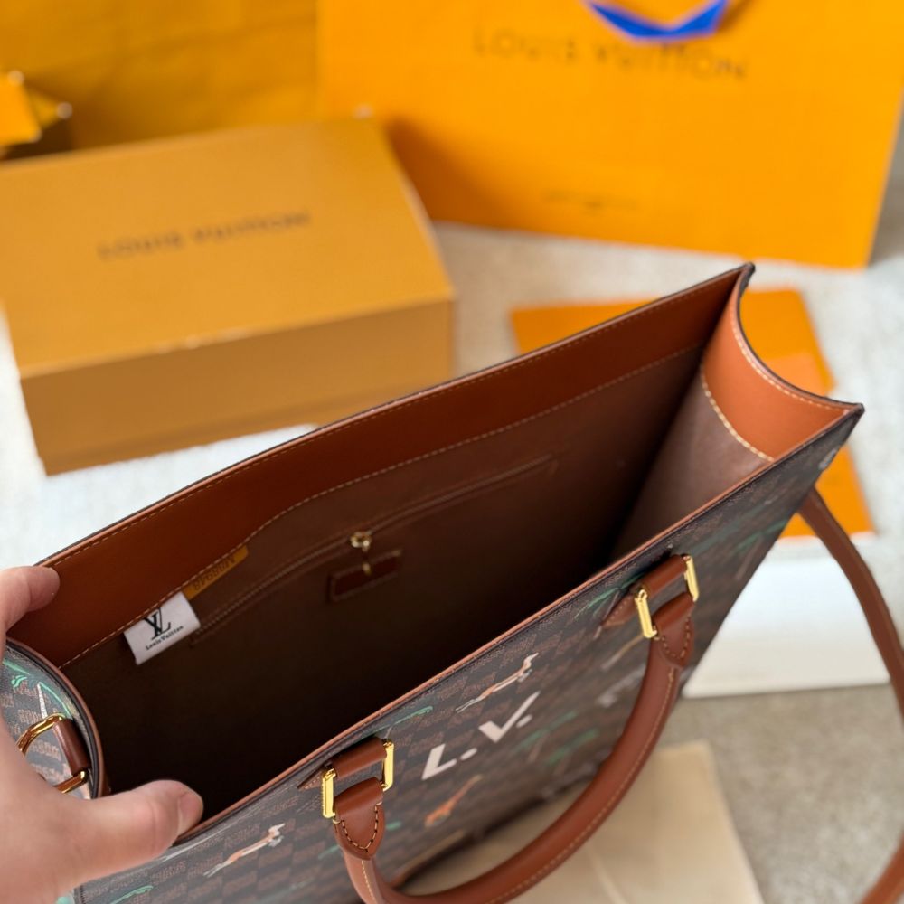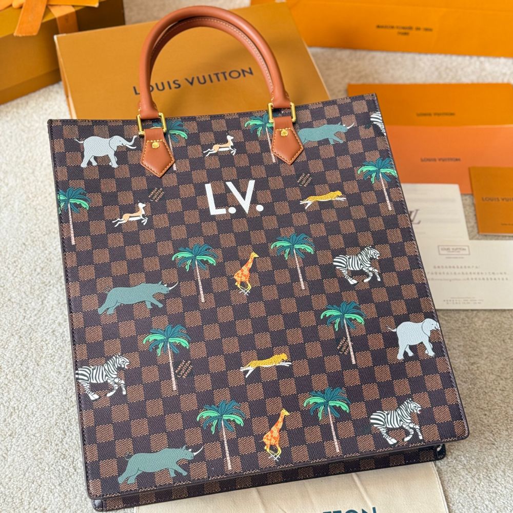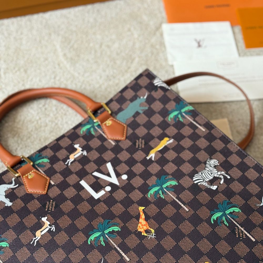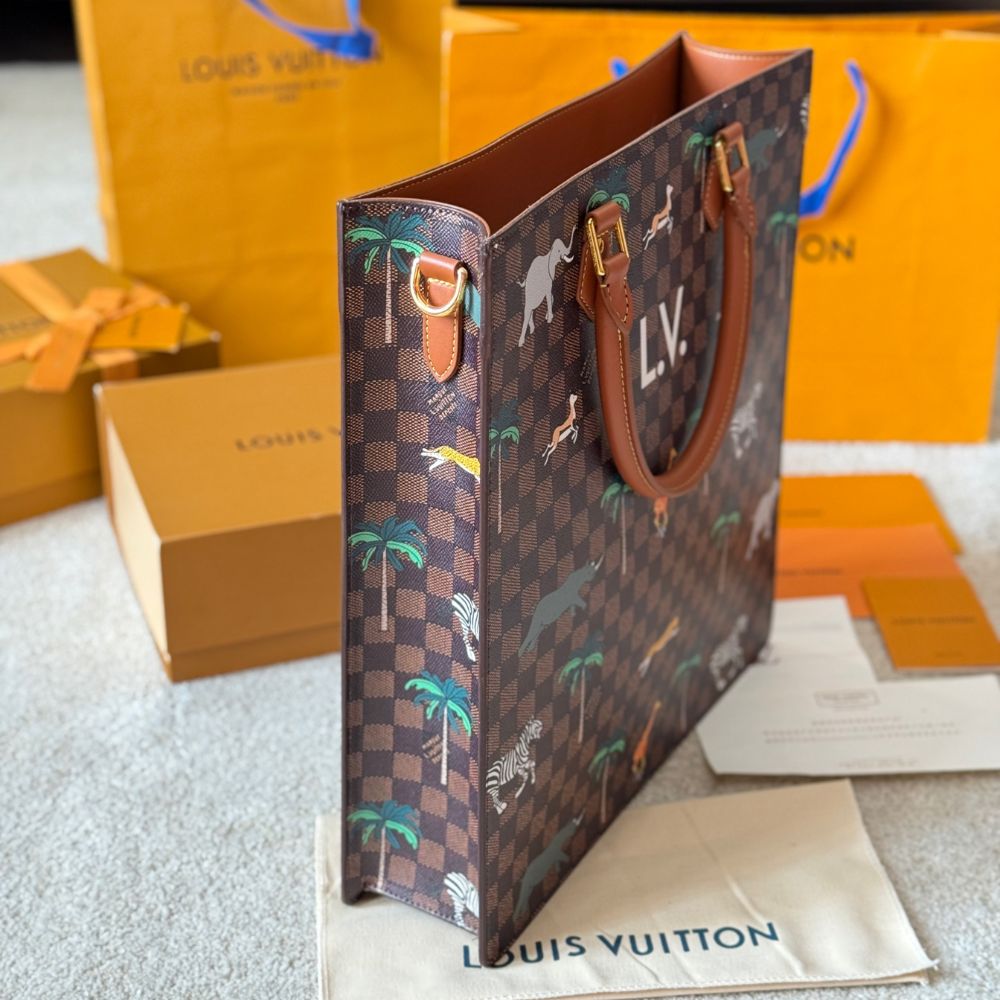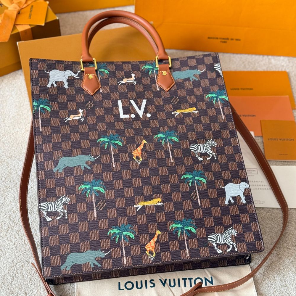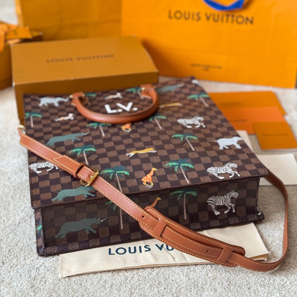 The Sac Plat in Damier Heritage canvas, accented with brown leather trim, showcases a dynamic print of wild animals stampeding across its surface. Bold white L.V. initials crown the design, a nod to the film. Inside, a brown cotton lining and zipped pocket offer practicality, while a detachable, adjustable strap adds carry options.