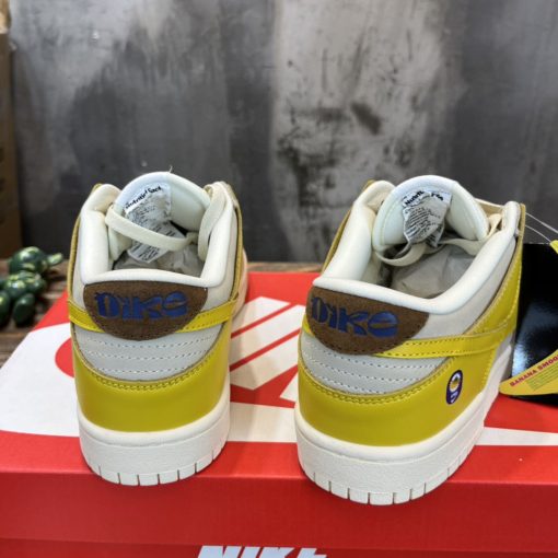 The NK Dunk Low Banana reveals a white base on which are superimposed yellow inserts reminiscent of the colors of the banana, particularly at the level of the side swoosh . The brown reinforcement at the heel brings contrast to the shoe while the beige sole enhances the look of the shoe.
