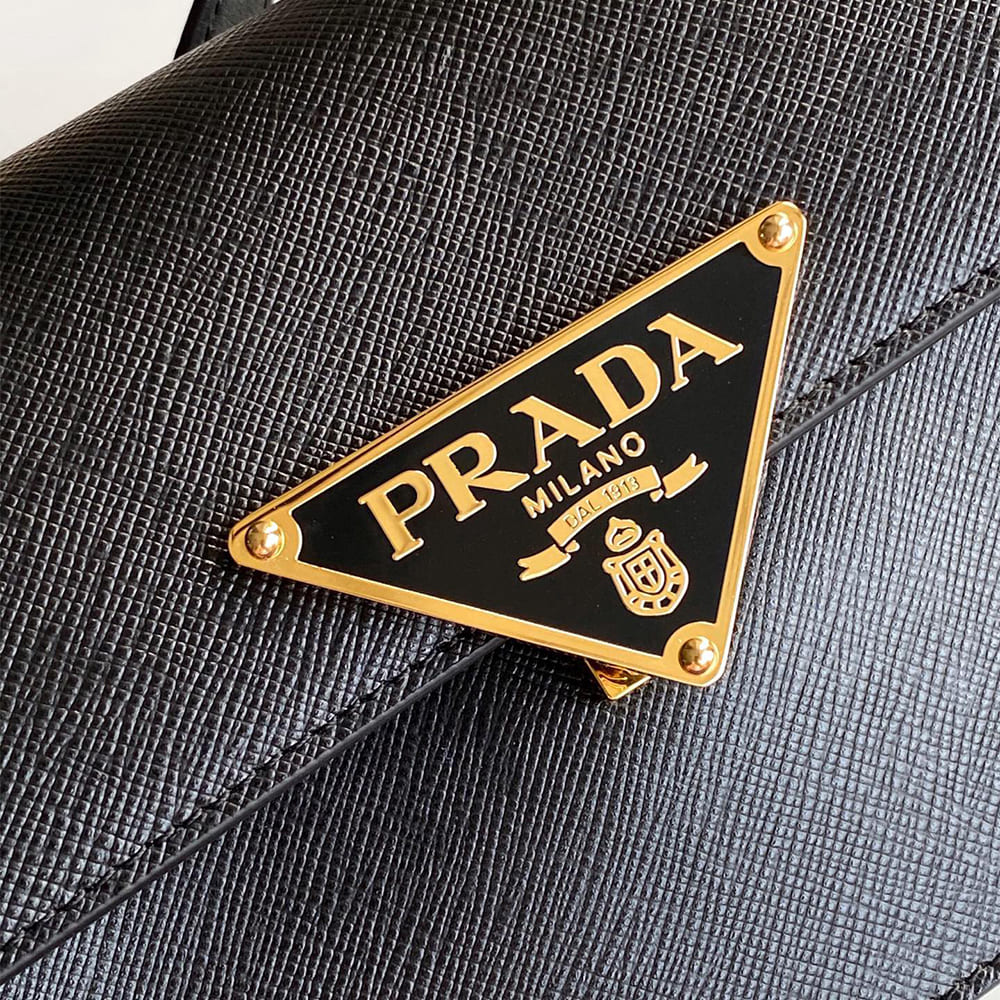 Logo-engraved push-lock clasp on the flap