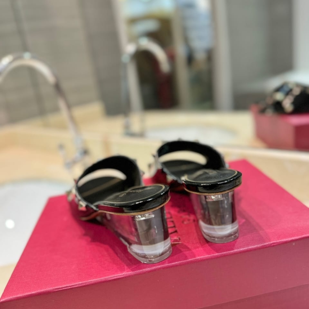 The Valentino Garavani Rockstud Skin Heeled Sandals in black are a bold fusion of contemporary edge and high-fashion luxury. These sandals feature slender straps embellished with the Maison’s signature gold-finish pyramid studs, set against polished patent leather. The avant-garde design is defined by a striking clear plexiglass wedge heel, creating a sophisticated “floating” effect. With their open-toe silhouette and minimalist construction, these heels serve as a glamorous statement piece for both modern evening wear and elevated daytime looks.